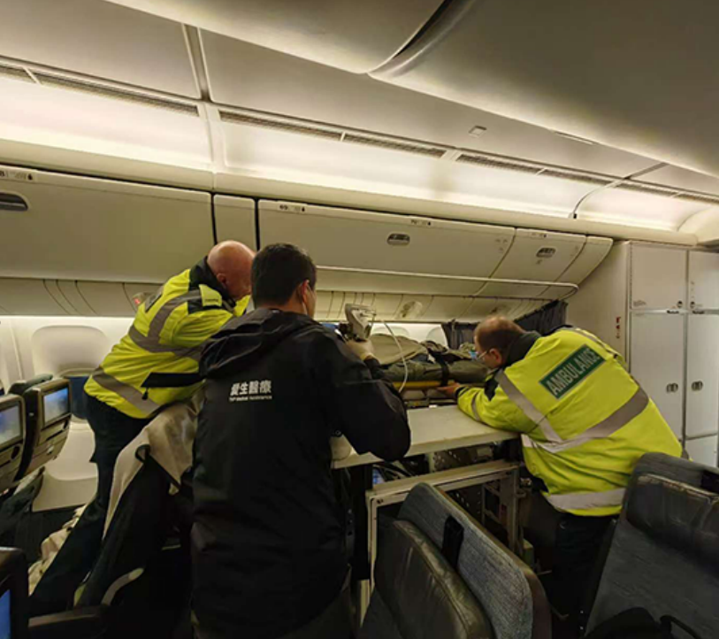 The mission began at the bedside in Chengdu. We validated ventilator settings, confirmed the secretion and humidification strategy, and set a sedation plan that would remain stable across handovers. Pressure-injury prevention started before the first lift. Our team supervised every stretcher transition – from ambulance to airport, across the jet bridge, and into the aircraft – ensuring secure positioning and airway protection.