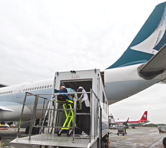 With cross-team coordination, the stretcher is steadily lifted into the aircraft